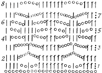 8-й ряд — 3 петли подъема, 2 столбика с накидом над столбиками с накидом предыдущего ряда и 1 столбик с накидом арку из 5 воздушных петель, * 5 воздушных петель, 7 столбиков с накидом (1-й — в арку из 5 воздушных нетель, 2-6-й — над столбиками и 7-й — в следующую арку из 5 воздушных петель) * В конце ряда 4 столбика с накидом.