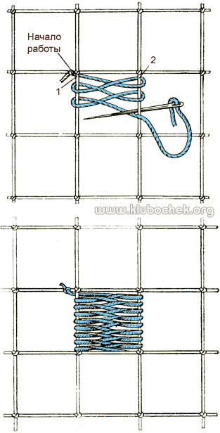«Настил с обвивкой» выполняют следующим образом. Если нужно заполнить одну клетку сетки, вышивальную нитку привязывают к узелку этой клетки и ведут ее под столбиком 1. Затем нитку ведут над столбиком 2 и под ним, все время прокладывая ее поверх проложенной нитки. Потом кладут вышивальную нитку над столбиком 1. Далее ведут нитку вниз под столбиком 1, затем над столбиком 2. Так продолжают выполнять стежок за стежком, пока не заполнится вся клетка. Для того чтобы настил получился плотнее, образовавшиеся уже стежки сверху заполненной части клетки подвигают иглой. Заполнив плотно одну клетку, переходят к заполнению следующих.